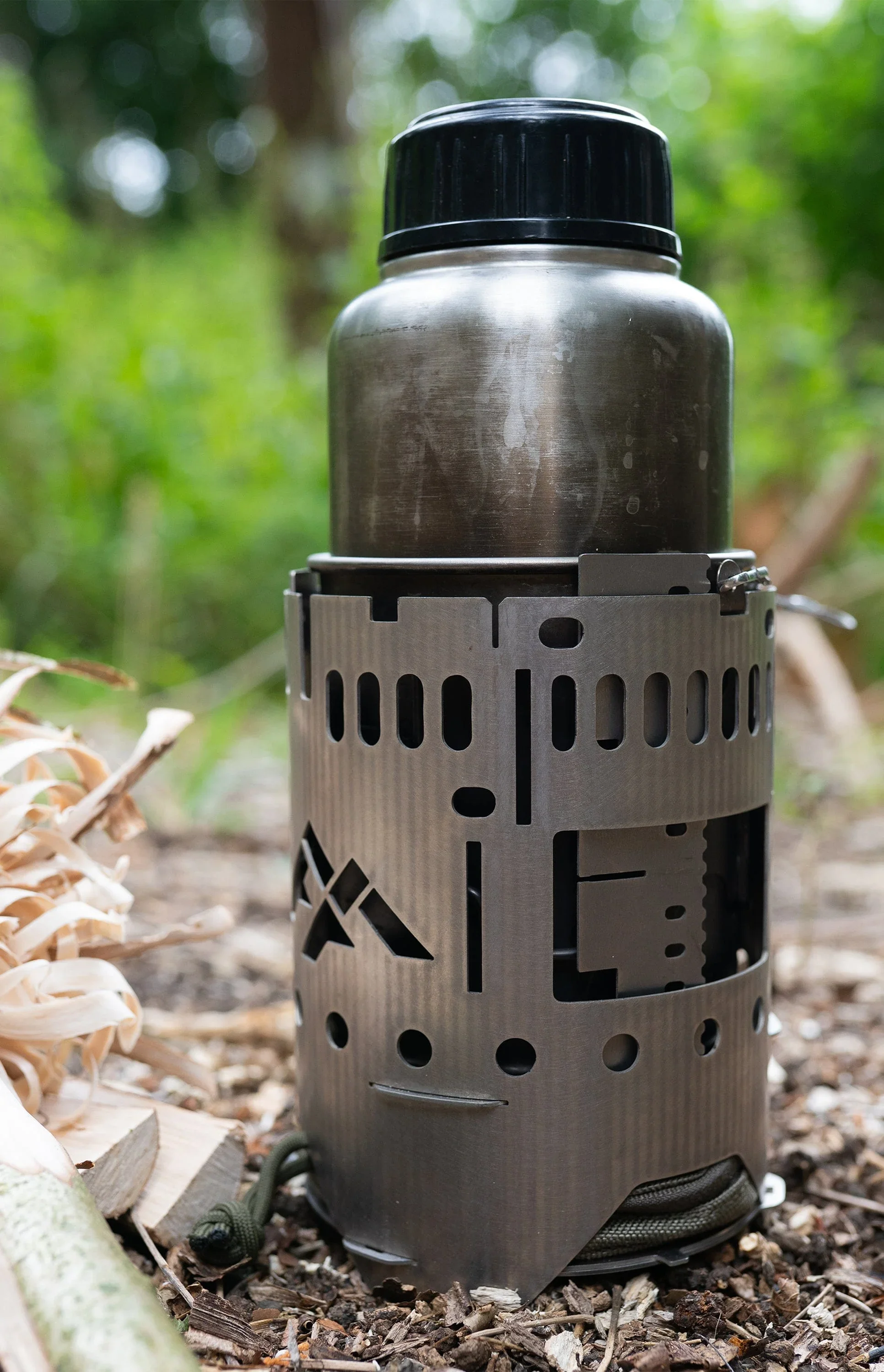 The stainless steel construction is tough, easy to clean, and won’t retain flavours — perfect for long days in the woods or extended bushcraft trips. The removable cup doubles as both a drinking vessel and cook pot, making it practical for hot drinks, reheating meals, or boiling water with the included stove setup.